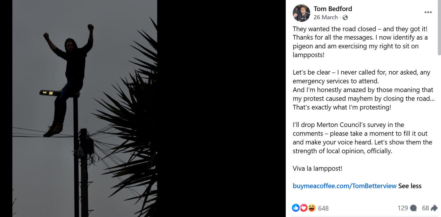 Scroll down to read today’s story about the anti-LTN campaigner who found himself in court after spending six hours on top of a lamppost swearing at police — and what his radicalisation says about the future of politics, media, and protest in the capital.