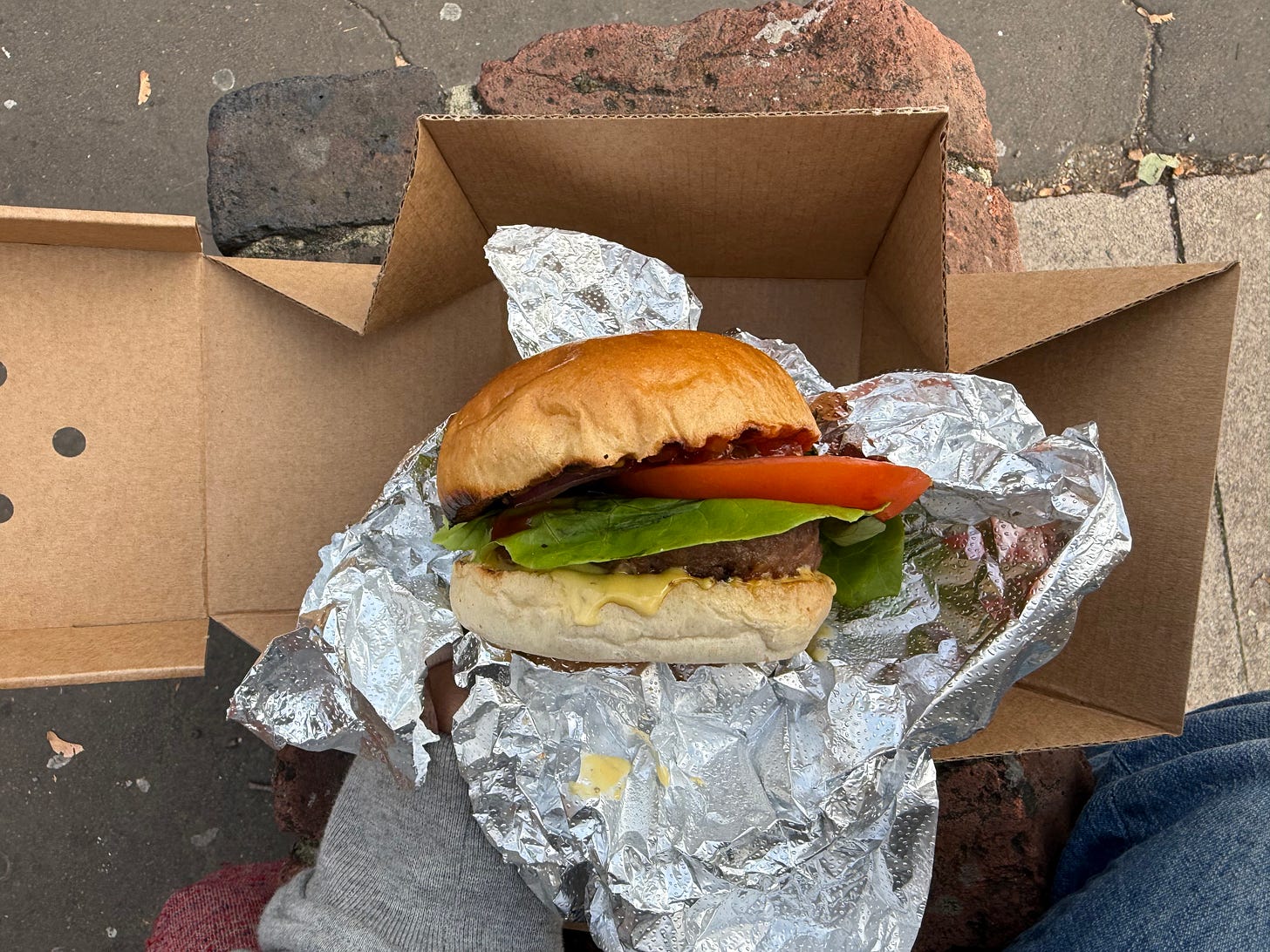 Half a mile from the Athenian we ordered a Classic Veggie burger. The staff at the Greek restaurant momentarily stopped making gyros and cooked the burger, which was put into an unbranded box and sent out to us with a local delivery rider. It was fine. The flavours were uninteresting but it struck a reasonable balance between being soft and crisp. It had a respectable crunch. All of this cost £14.66 — which had to be split between Deliveroo, the delivery driver, GBK, Growth Kitchen, and ultimately the local restaurant that had to cook it. It is simultaneously not cheap, while also not making much money for the people actually making the food.