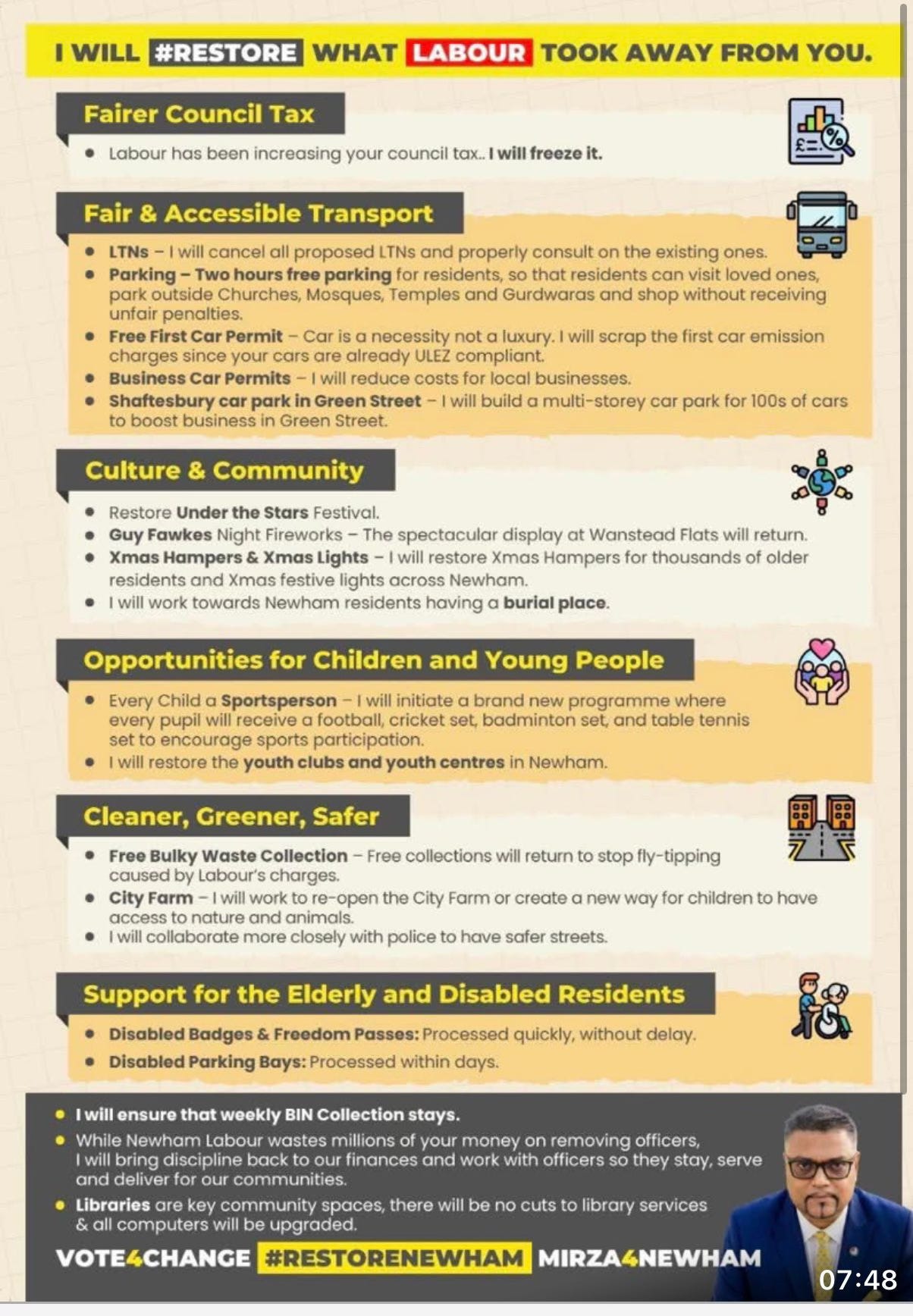 Mehmood Mirza, the Newham Independents’ mayoral candidate, initially targeted Labour over its policies on the war in Gaza but has now branched out into maintaining weekly bin collections, providing plentiful free parking, and build a new multi-storey car park in Forest Gate.
