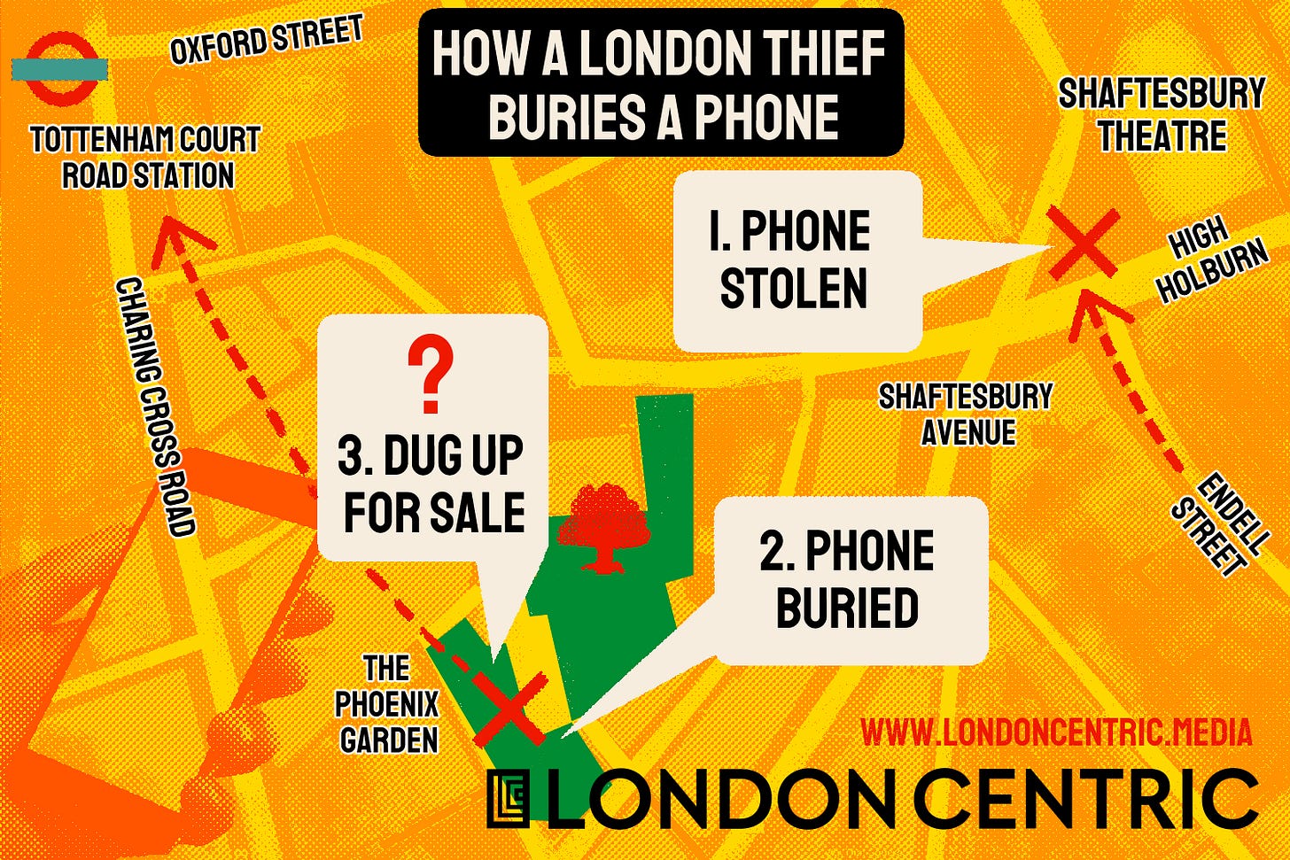 What happened next will be far less familiar. The thief took the phone around the corner to the Phoenix Garden, a small community-run patch of green behind Shaftesbury Avenue in the middle of central London. It’s a special space where volunteers maintain an urban oasis on a former bomb site for locals and tourists to take a breather. To the despair of the volunteers, Phoenix Garden is doubling up as a storage facility for central London’s stolen phones – and they can’t get the Metropolitan police to take it seriously.