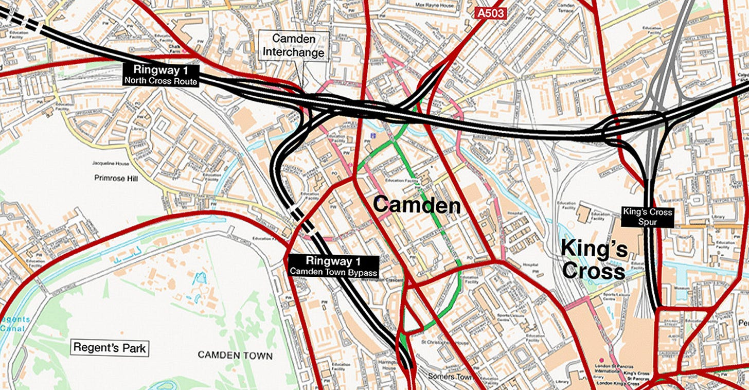 Imagine walking out of Camden Town tube station, turning north towards Camden Market and finding yourself facing a twelve-lane concrete motorway full of roaring traffic. This was the intended outcome of the 1960s Ringways plan to drive four giant circular roads through the capital in order to enable millions of Londoners to drive their private cars straight through the heart of the city.