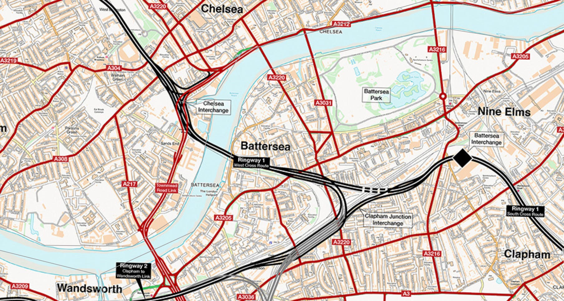 The main Los Angeles-style north-south inner London motorway would have been the West Cross Route, running down through Kensington, Earls Court, through Brompton Cemetery, then over the Thames to a giant interchange built on top of Clapham Junction railway station.