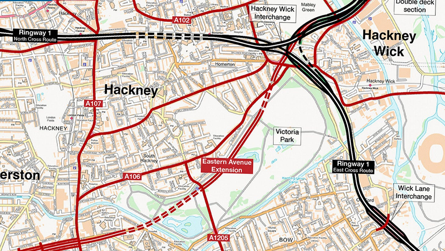 Victoria Park would have had a major road running across its northern edge which would then carve a new route across Bethnal Green, dive into a tunnel along City Road, and then emerge at a new motorway junction at Angel in Islington.