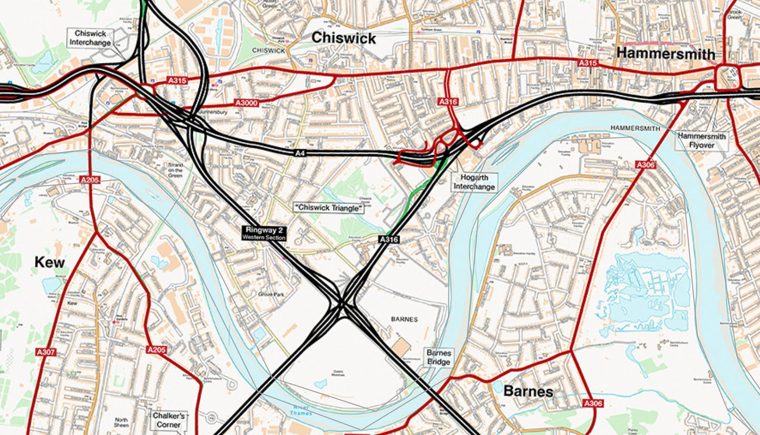 A little further south, the whole of Chiswick would have become a giant network of motorways. What’s now open playing fields near the Thames would be a series of expressways.