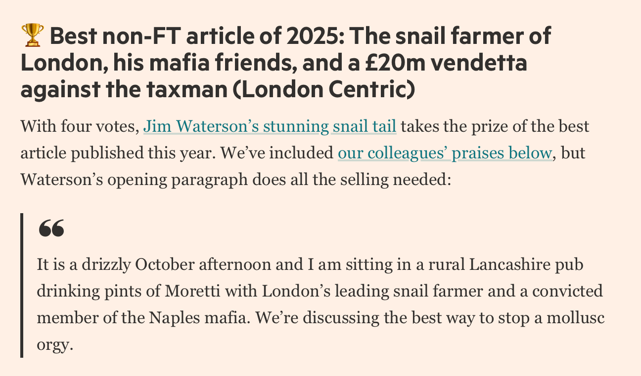 Amazingly, in what’s probably the best honour I could imagine receiving, they voted London Centric’s piece on the capital’s tax-avoiding snail farmer as their top pick of the year.