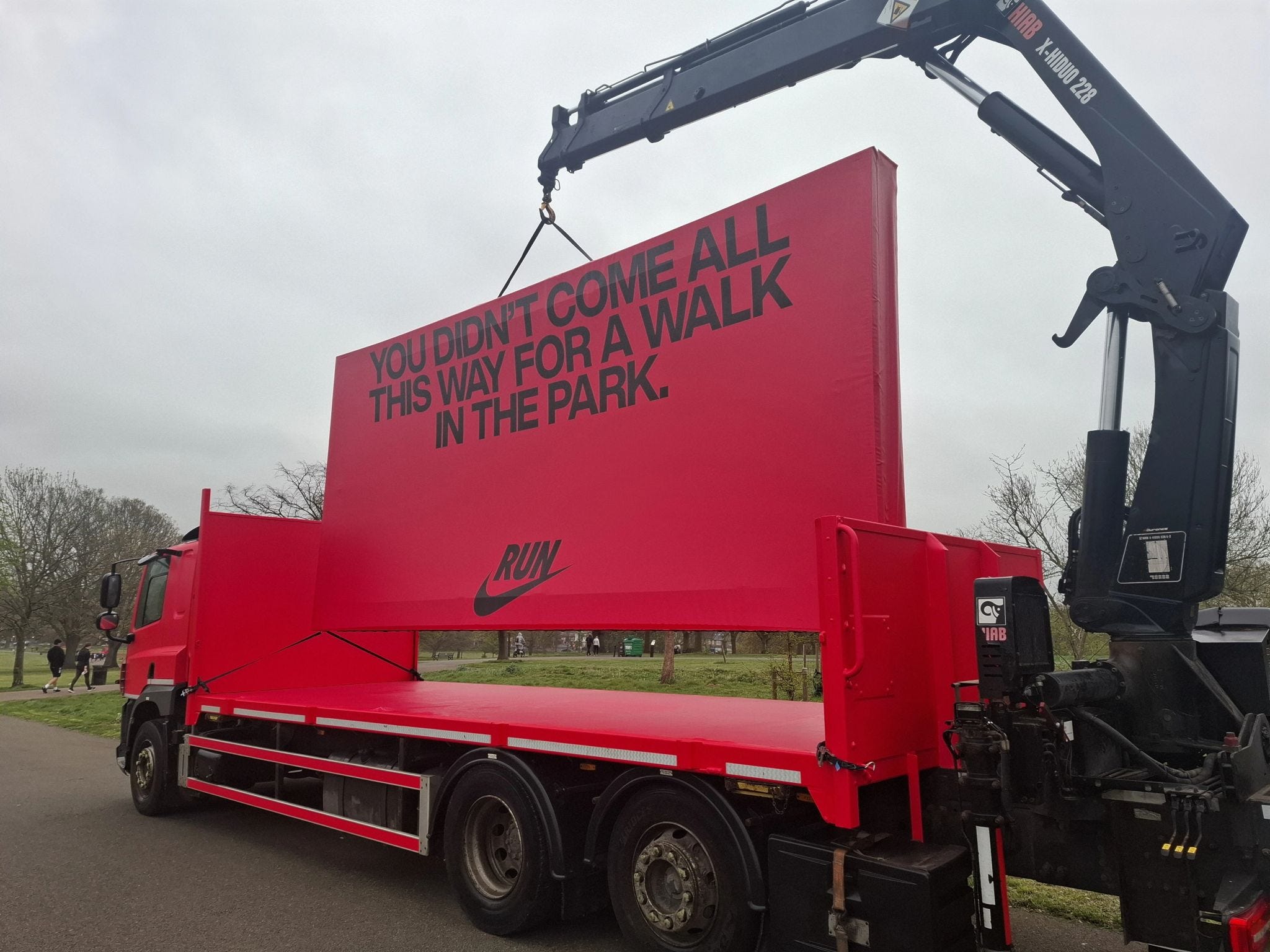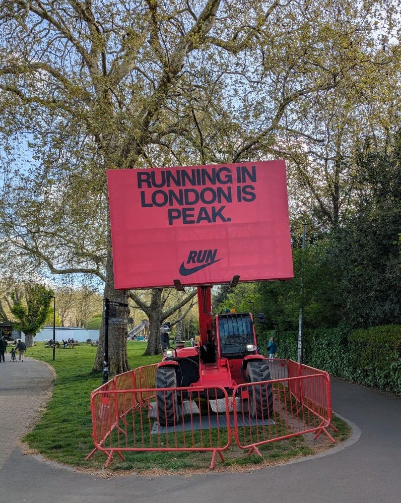 Runners who turned up to Peckham Rye in south London for their local parkrun last weekend were met with a surprise, after Nike filled the public park with ambush marketing material, including a billboard dangling from a cherry picker featuring the slogan “You didn’t come all this way for a walk in the park.”
