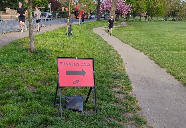 I also really dislike the 'runners only' signs, because parkrun makes a real effort to remind people that they don't have exclusive use of the park. A decent chunk of people in the park for non parkrun reasons aren't going to differentiate between the Nike signs and the actual parkrun ones (which usually say 'Caution, runners') and are going to either feel like they're being banned from parts of the park or just even more annoyed with the whole thing than they already were. It's just making running the event harder for the volunteers