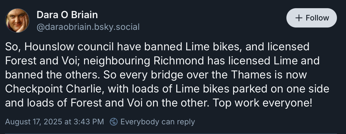Intriguingly, both articles contain a new PR line from a Lime representative directly confronting claims by London Centric about the risk of ‘Lime bike leg’. Lime confidently told the publications: “Our data shows no identifiable trend relating to leg injuries among Lime riders in the UK.”Hounslow council in west London has de facto banned Lime from its streets, causing chaos on the borough’s boundaries as e-bike riders suddenly have to abandon their rides. The story was broken by local news reporter Dara Ó Briain, who had a previous career as a prominent comedian.